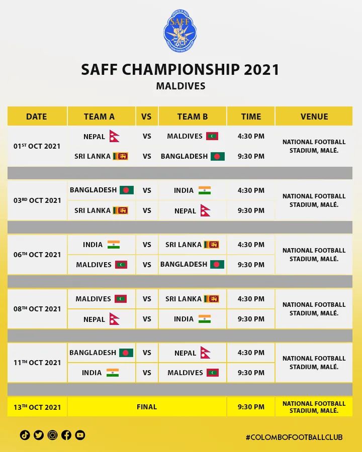 Colombo Football Club On Twitter Saff Championship 2021 Fixtures 13th Edition Of Saff Championship Will Be Held In Maldives From 01st October 13th October 2021 Footballsrilanka Saff Goldenarmy Nevergiveup